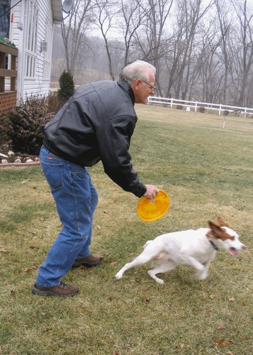 Dad and Olive play catch while we're outside.